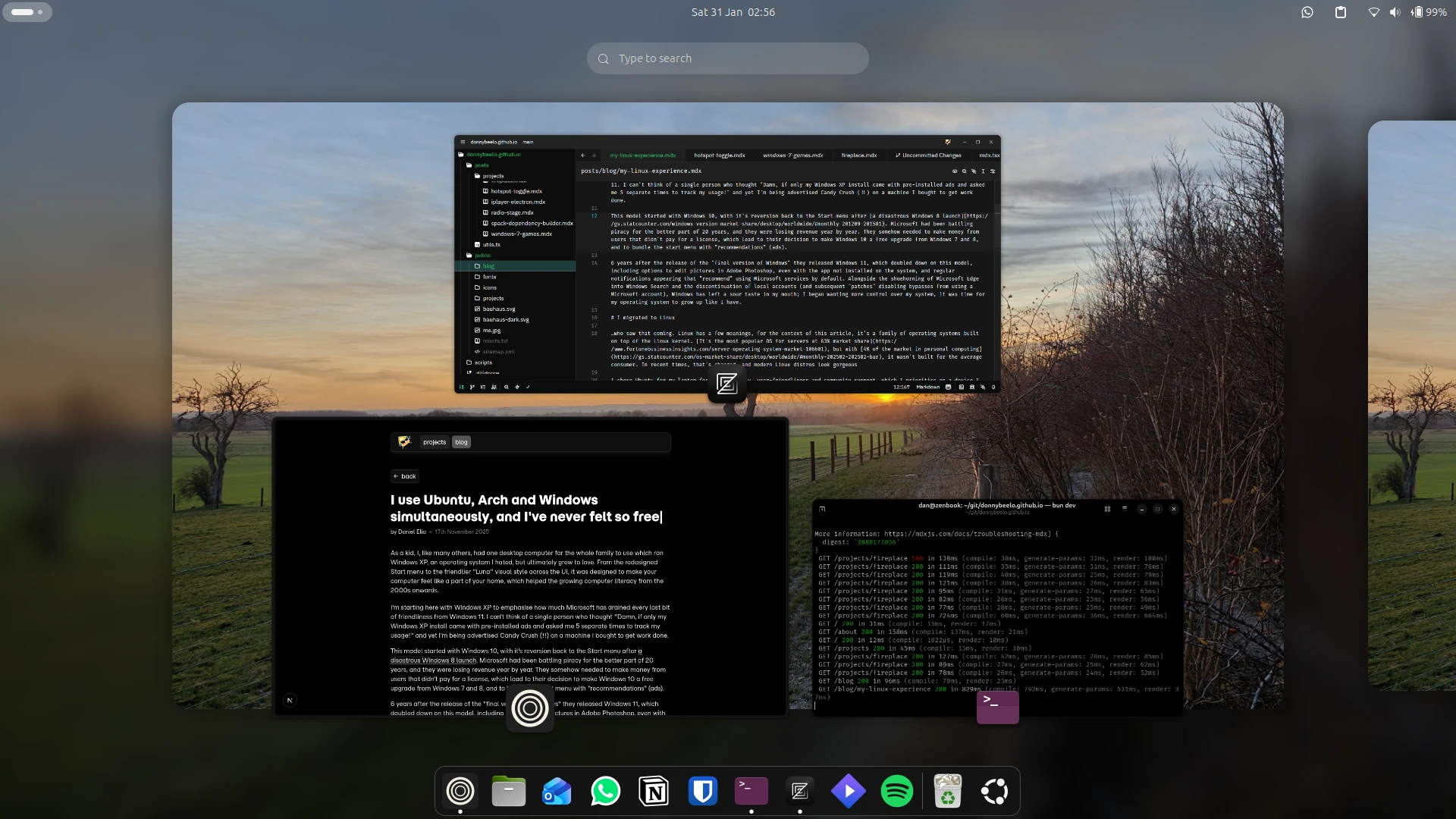 For my desktop computer, I went for Omarchy. Although, in my opinion, DHH is a fork in a world of soup, he nailed it with this. Arch is one of the most fun Linux distros out there, and paired with Hyprland it's great for productivity, so much so I began reaching for my PC more often to get work done. On top of all of that, I have to commend the installation process; Arch is an absolute faff to get going, and to have to configure your window manager from scratch kills it for me, but Omarchy's simple installation process puts every other distro I've tried to shame, less to say it wipes the floor with Windows 11's OOBE.