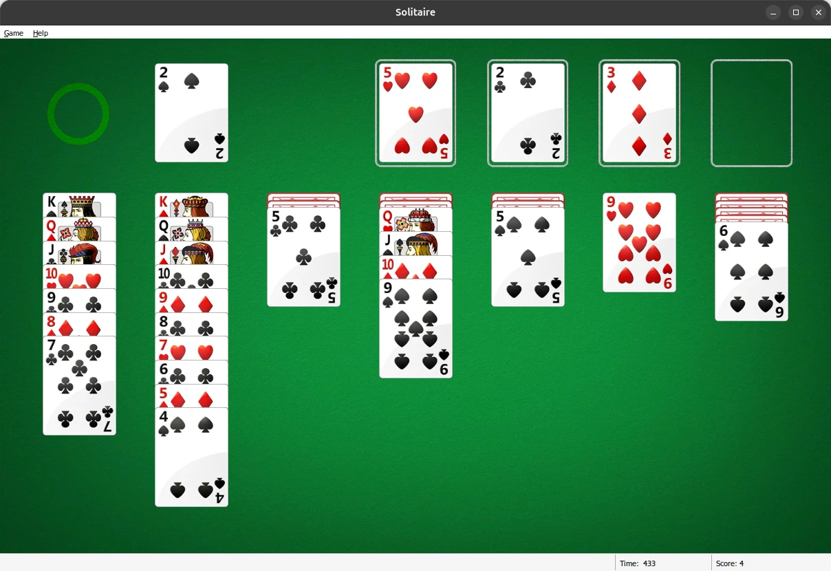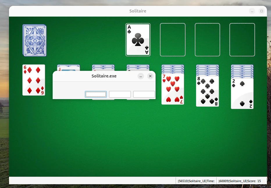 So, I decided to deal with the devil, and with the installer of dubious origin, I had Solitaire running on my machine under Wine. This came with a few issues; the sound files were not being played back properly, if they played at all, the menus had no text, and many features simply didn't work, like the hint button, undoing moves or even the options menu to change the theme.